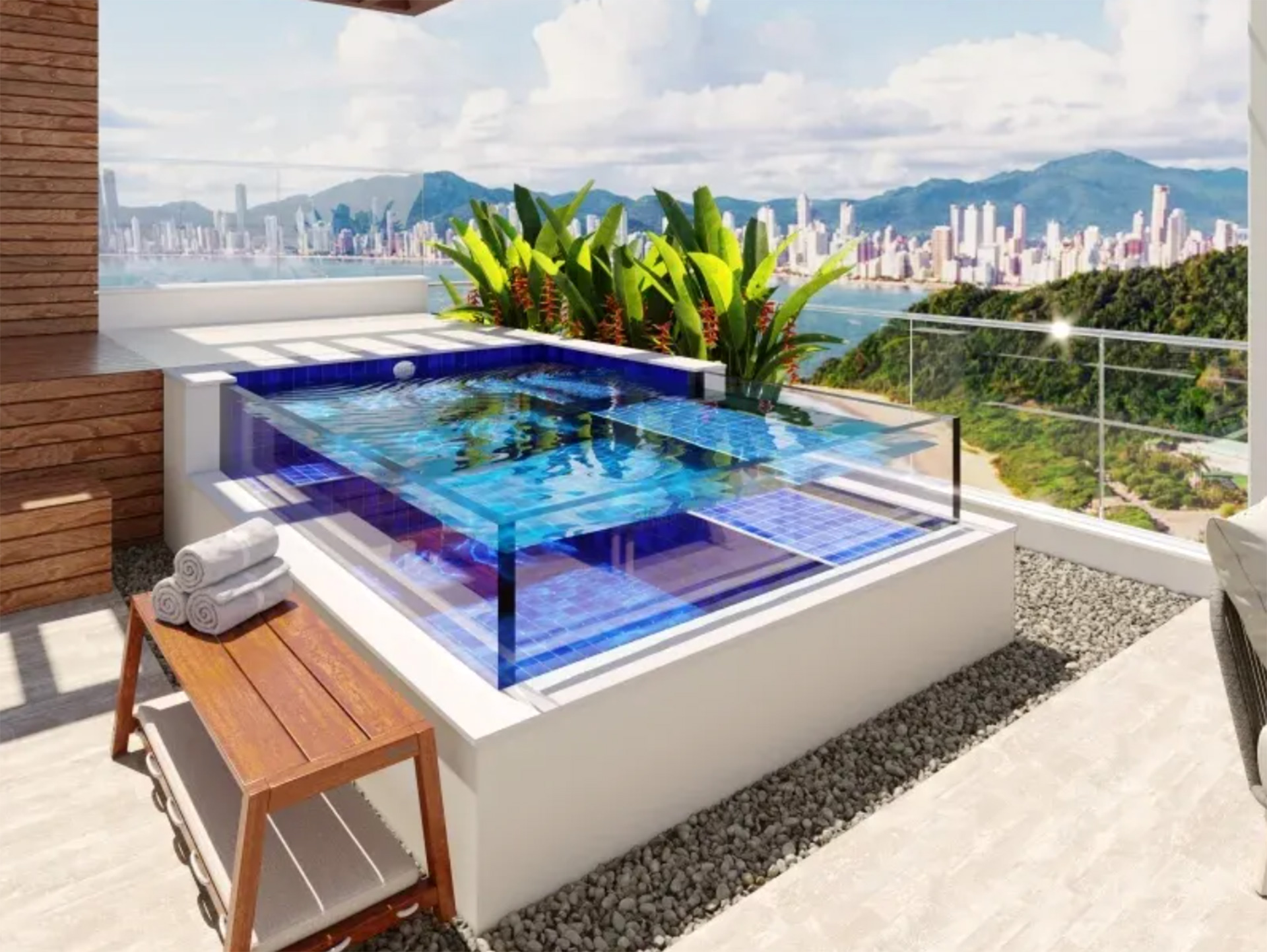 Você pode configurar sua piscina com acessórios incríveis, como: Transparência, Aquecimento, Fibra Ótica (fundo estrelado), Cascatas, Pedras Naturais para a borda (iGUi STONE), interatividade (Eletronic System), entre várias outras possibilidades.